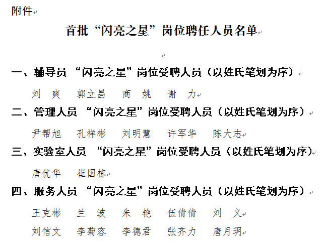 根据《西南交通大学“闪亮计划”实施办法(修订)》(西交党[2016]45号)文件要求,严格按照相关选拔程序,并经校党委认真研究,决定聘任学校首批“闪亮之星”岗位人员21名,其中辅导员4名,管理人员5名,实验室人员2名,服务人员10名。