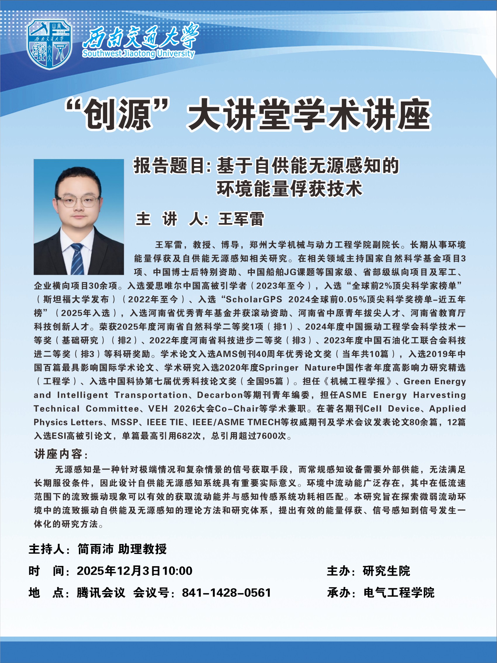 12月3日“创源”大讲堂:基于自供能无源感知的环境能量俘获技术