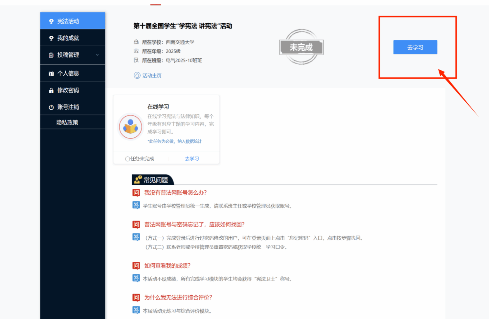 为推动学生积极参与“宪法卫士”行动计划,学生按照要求完成在线学习、课后练习、成果检测等任务后,可获得思想政治与道德素养类1学时。